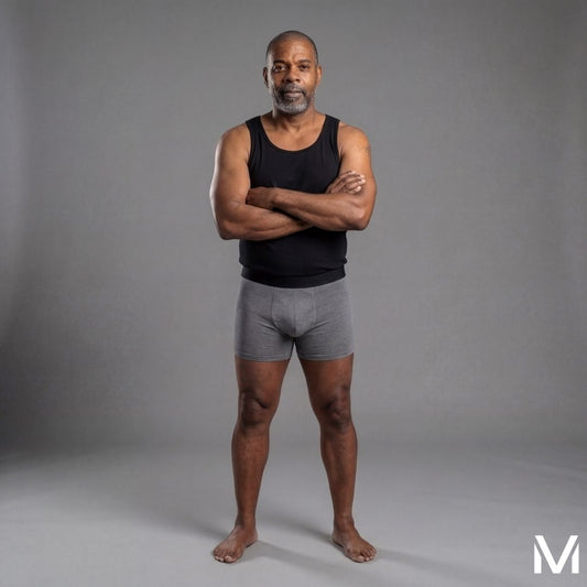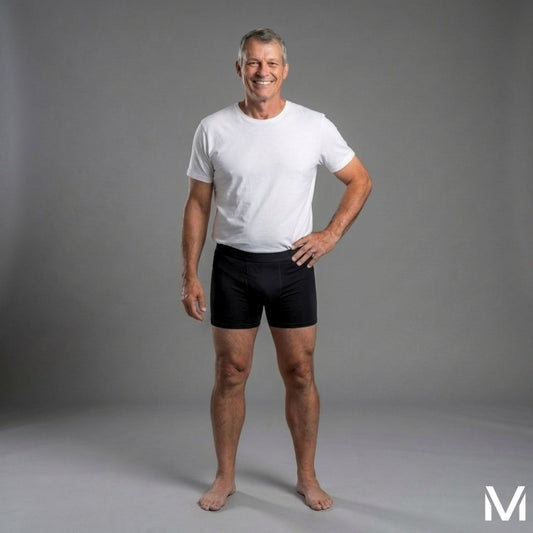 The first boxer brief that holds up to 300ml (10.14 fl oz). 9 layers of protection placed exactly where you need it. Front, back, and sides. Bamboo fabric that absorbs quick, dries fast, and kills odor before it starts. No bulk. No visible lines. Nobody can tell.